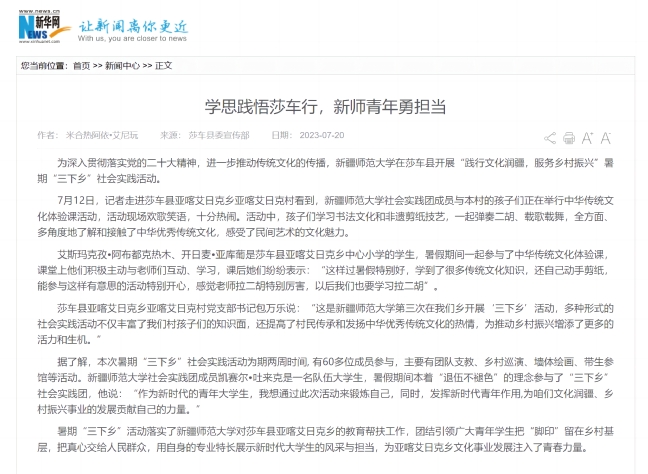 暑期“三下乡”活动落实了365英国上市公司官网对莎车县亚喀艾日克乡的教育帮扶工作,团结引领广大青年学生把“脚印”留在乡村基层,把真心交给人民群众,用自身的专业特长展示新时代大学生的风采与担当,为亚喀艾日克乡文化事业发展注入了青春力量。