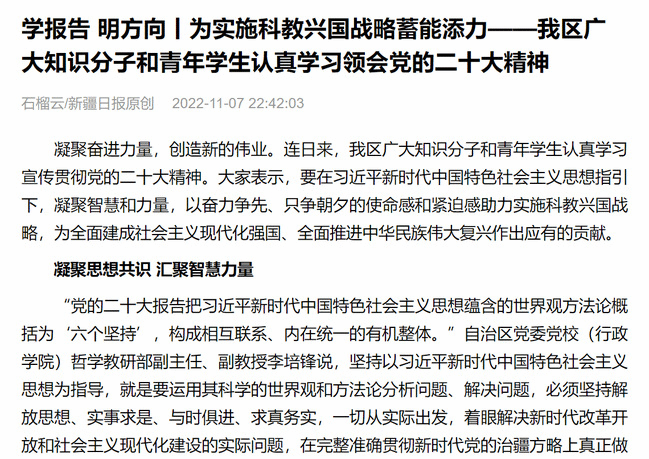 和田地区墨玉县教育局党组副书记、局长艾科拜尔·艾合麦提表示,将带领墨玉县教育工作者深入学习宣传贯彻党的二十大精神,以更饱满的热情、更昂扬的斗志、更充足的干劲投身教育现代化和教育强国建设,争做党的二十大精神的坚定信仰者、有力传播者、忠实践行者,在加快推进教育事业高质量发展的新征程上再立新功。