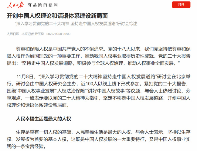 11月8日,“深入学习贯彻党的二十大精神坚持走中国人权发展道路”研讨会在北京举行。研讨会由中国人权研究会主办,近100人以线上线下形式参加。紧扣党的二十大报告,围绕“中国人权事业发展”“人权法治保障”“讲好中国人权故事”等议题,与会人士热烈讨论、分享观点,一致表示要以党的二十大精神为指引,坚定不移走中国人权发展道路,开创中国人权理论和话语体系建设新局面。