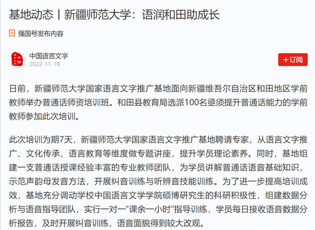 新疆少数民族学前教育是新疆基础教育发展的重点领域,学前师资队伍的国家通用语言文字应用水平关乎少数民族儿童未来发展。此次针对和田地区学前教师的国家通用语言文字培训,对推动新疆基础教育发展具有重要意义。