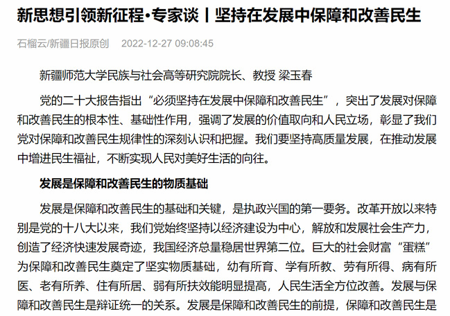 发展是保障和改善民生的基础和关键,是执政兴国的第一要务。改革开放以来特别是党的十八大以来,我们党始终坚持以经济建设为中心,解放和发展社会生产力,创造了经济快速发展奇迹,我国经济总量稳居世界第二位。巨大的社会财富“蛋糕”为保障和改善民生奠定了坚实物质基础,幼有所育、学有所教、劳有所得、病有所医、老有所养、住有所居、弱有所扶效能明显提高,人民生活全方位改善。发展与保障和改善民生是辩证统一的关系。发展是保障和改善民生的前提,保障和改善民生是发展的最终目的。伴随国家发展进程,新疆经济发展取得历史性成就,为保障和改善民生提供了充裕物质条件。2021年,新疆地区生产总值接近1.6万亿元,城镇居民年人均可支配收入达37642元,农村居民年人均可支配收入达15575元。党的十八大以来,新疆就业、教育、医疗、社保、住房等民生事业全面进步,各族群众的获得感、幸福感、安全感显著增强。