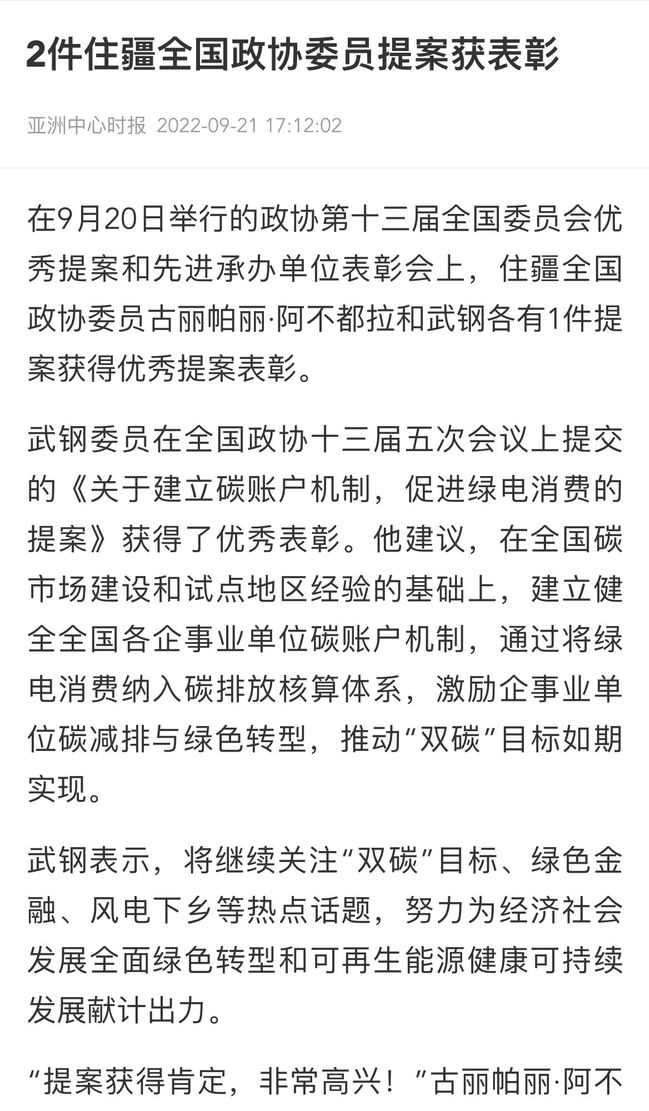 在9月20日举行的政协第十三届全国委员会优秀提案和先进承办单位表彰会上,住疆全国政协委员古丽帕丽·阿不都拉和武钢各有1件提案获得优秀提案表彰。