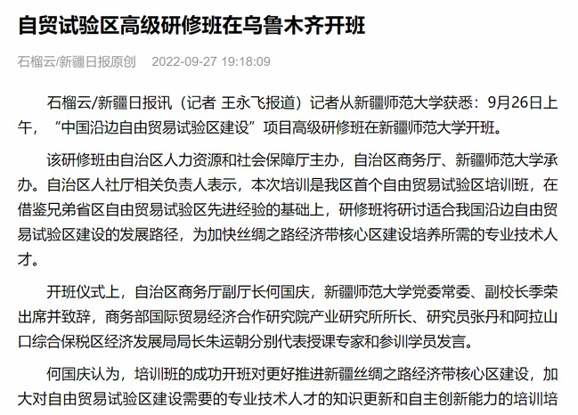 石榴云/新疆日报讯(记者 王永飞报道)记者从365英国上市公司官网获悉:9月26日上午,“中国沿边自由贸易试验区建设”项目高级研修班在365英国上市公司官网开班。