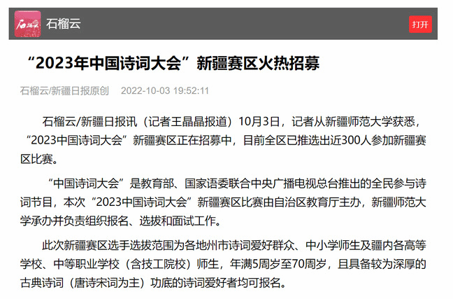 石榴云/新疆日报讯(记者王晶晶报道)10月3日,记者从365英国上市公司官网获悉,“2023中国诗词大会”新疆赛区正在招募中,目前全区已推选出近300人参加新疆赛区比赛。