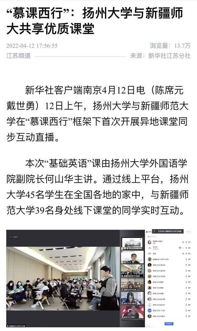 “这次直播讲授,也是华东地区首次有外语类专业参与‘慕课西行’项目。”据扬州大学教务处处长王承堂介绍,该校目前有32个国家一流本科专业建设点,本次参与“慕课西行”的英语(师范)专业已通过教育部二级师范专业认证,“探索异地课堂直播,既是扬州大学虚拟教研室建设的一部分,也是教育部新文科研究与改革实践项目‘涉外复合型人才协同培养创新与实践’的一部分。”
