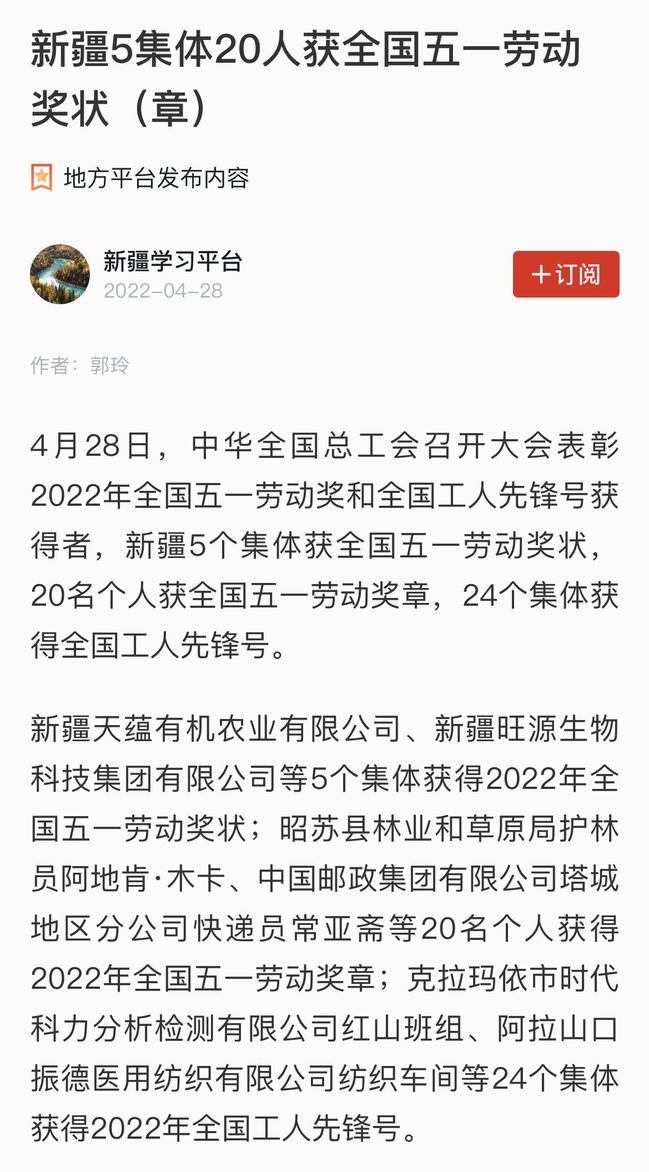 新疆天蕴有机农业有限公司、新疆旺源生物科技集团有限公司等5个集体获得2022年全国五一劳动奖状;昭苏县林业和草原局护林员阿地肯·木卡、中国邮政集团有限公司塔城地区分公司快递员常亚斋等20名个人获得2022年全国五一劳动奖章;克拉玛依市时代科力分析检测有限公司红山班组、阿拉山口振德医用纺织有限公司纺织车间等24个集体获得2022年全国工人先锋号。