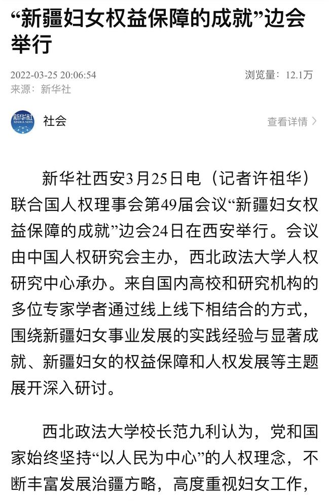 新华社西安3月25日电(记者许祖华)联合国人权理事会第49届会议“新疆妇女权益保障的成就”边会24日在西安举行。会议由中国人权研究会主办,西北政法大学人权研究中心承办。来自国内高校和研究机构的多位专家学者通过线上线下相结合的方式,围绕新疆妇女事业发展的实践经验与显著成就、新疆妇女的权益保障和人权发展等主题展开深入研讨。