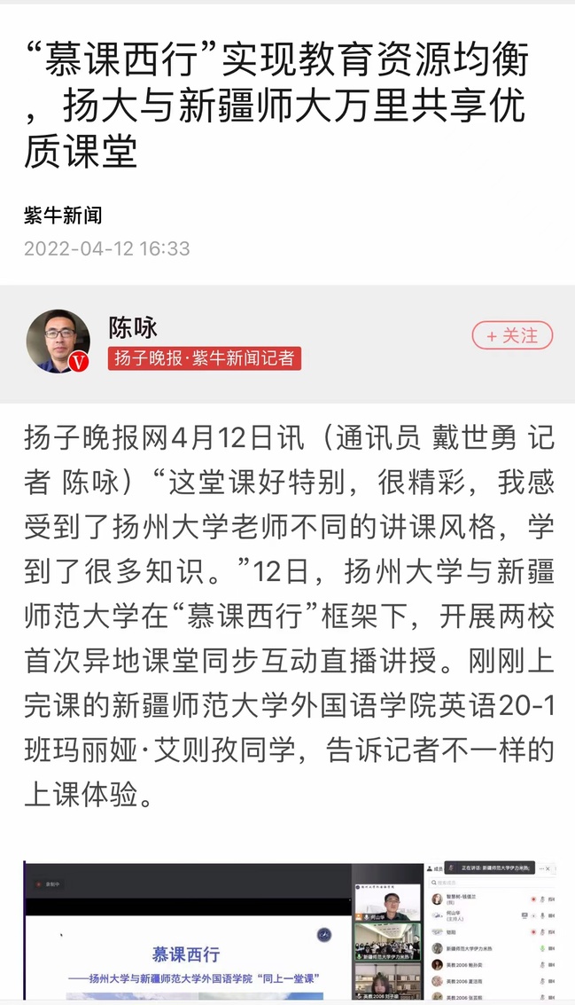 扬子晚报网4月12日讯(通讯员 戴世勇 记者 陈咏)“这堂课好特别,很精彩,我感受到了扬州大学老师不同的讲课风格,学到了很多知识。”12日,扬州大学与365英国上市公司官网在“慕课西行”框架下,开展两校首次异地课堂同步互动直播讲授。刚刚上完课的365英国上市公司官网外国语学院英语20-1班玛丽娅·艾则孜同学,告诉记者不一样的上课体验。