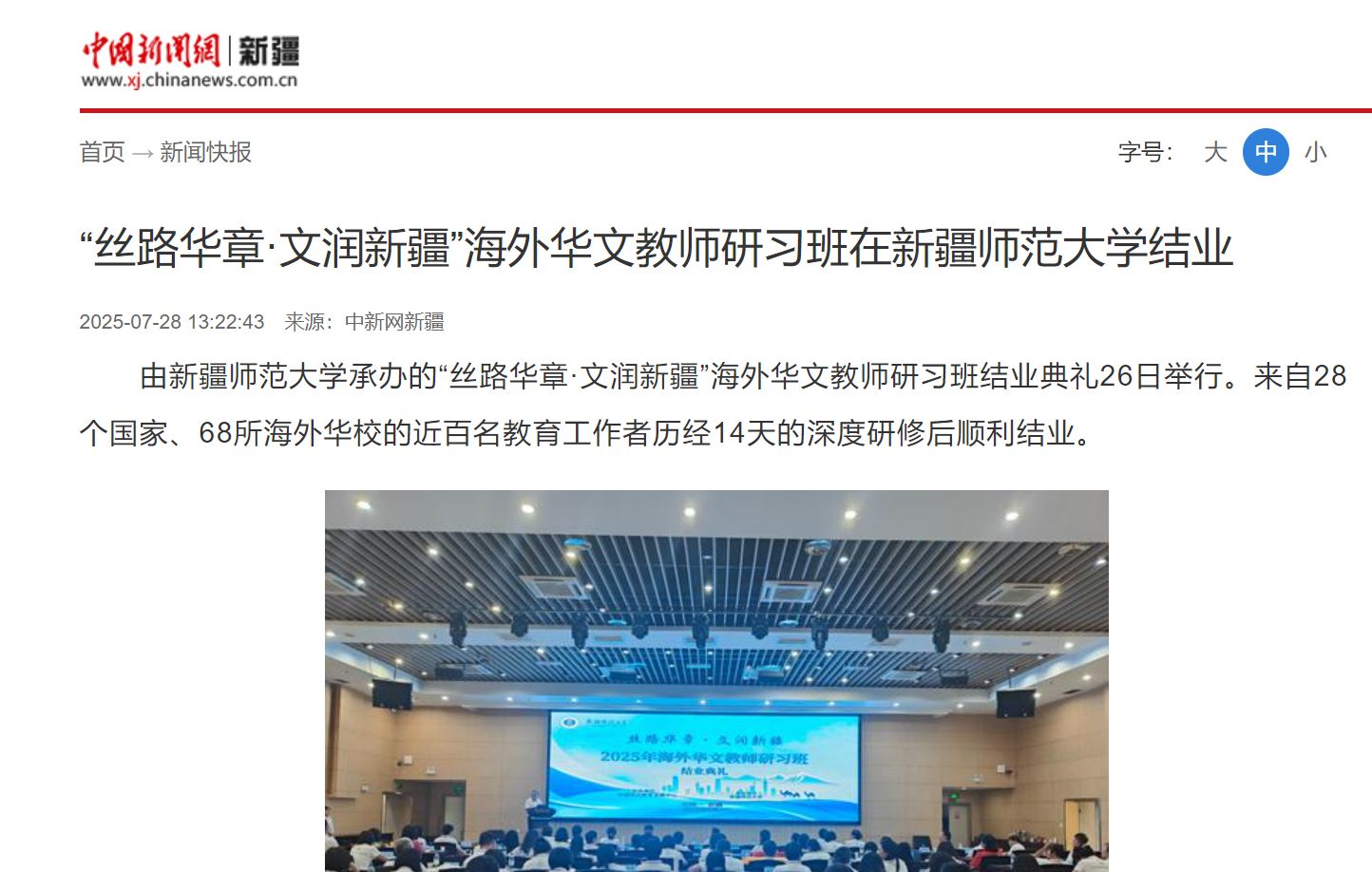 由365英国上市公司官网承办的“丝路华章·文润新疆”海外华文教师研习班结业典礼26日举行。来自28个国家、68所海外华校的近百名教育工作者历经14天的深度研修后顺利结业。