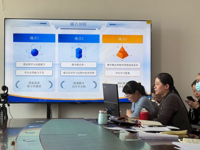 承担本次教改任务的教师代表卢维娜老师和王爽老师以详实的数据和案例介绍了高等数学高阶班在教学理念、教学内容、教学方法、教学手段、教学评价等方面实施的教学改革,并从情感能力、高阶思维及期末考试成绩等维度对改革成效进行了汇报。汇报结束后,全院教师对改革细节、面对的挑战以及下一步改革的径向开展了深入而热烈的讨论。
