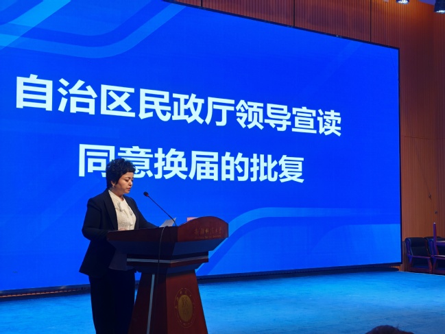 自治区民政厅社会组织管理局阿依古丽·依马木宣读同意换届批复