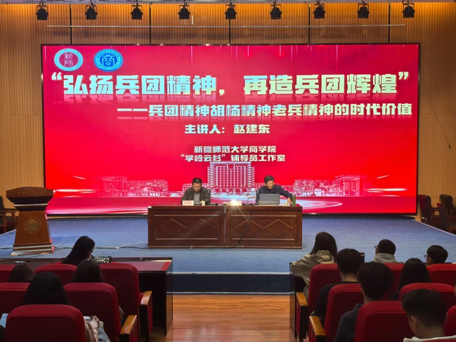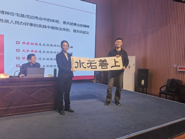 讲座中,赵建东老师以历史为脉络,结合军垦往事与英雄楷模事迹,追忆了兵团发展岁月中的艰辛曲折,对兵团精神、老兵精神和胡杨精神进行了深入系统的阐释和解读。赵建东老师表示,改革开放以来,兵团人把爱国奉献融入新时期新疆建设,把艰苦创业、开拓进取精神融入到新疆长治久安和民族团结工作中,怀揣“尚思为国戍和田”的家国精神,笃定“敢教日月换新天”的崇高追求。赵建东老师寄语学院学子,面对新时代新征程,要从兵团精神中汲取奋进力量,继承老一辈兵团人留下来的精神财富,在思想洗礼中传承红色基因、担当时代重任,把兵团精神融入立足当代、面向未来的奋斗中,努力为实现新疆工作总目标作出新的更大贡献。