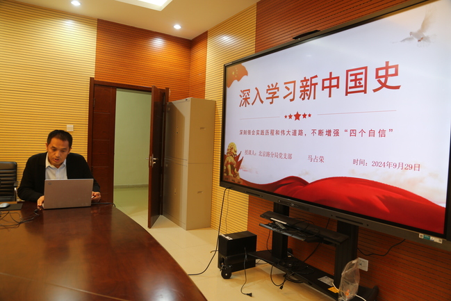 在学习交流环节,信息管理中心党支部书记杨勇带领大家共同学习;中国电信北京路分局党支部书记马占荣以“深入学习新中国史”为题,为全体党员讲授专题党课;大家还共同观看了微电影《神秘的电台》,感悟革命先烈艰苦奋斗不屈不挠的革命精神,加强党员爱国情怀,永葆共产党员的先进性。