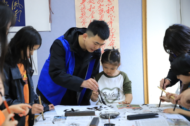 志愿者为书法小课堂的孩子们授课