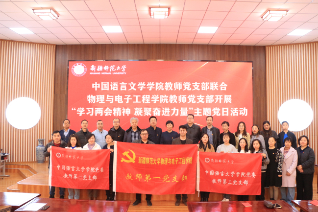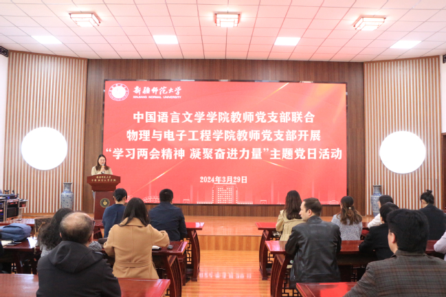为深入学习贯彻全国两会精神,准确把握两会精神实质,把思想和行动统一到党和国家的决策部署上,进一步激发党支部的组织活力,切实提高党支部的凝聚力和战斗力,3月29日下午,365英国中国语言文学学院教师党支部联合物理与电子工程学院教师党支部在温泉校区文科四号楼国学讲堂开展“学习两会精神,凝聚奋进力量”主题党日活动。本次活动由中国语言文学学院党委组织员何丹主持,物理与电子工程学院党委书记李莉、中国语言文学学院党委书记陈国栋,及两学院教师党支部党员参与此次活动。