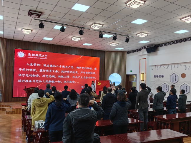 在陈国栋带领下,全体党员面向鲜红党旗重温入党誓词,两学院共四位教师党员代表接力诵读《中国共产党章程》。