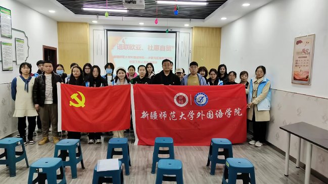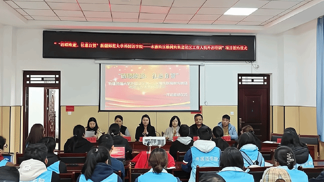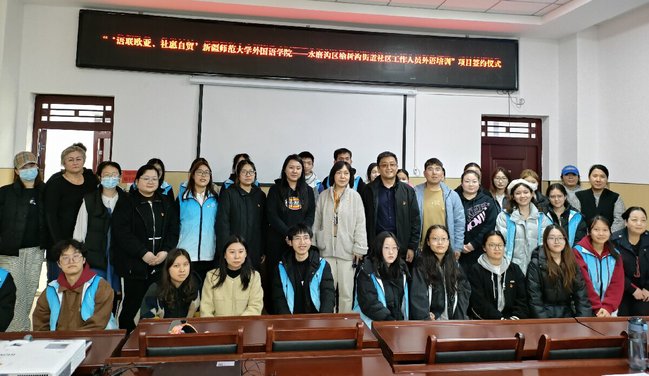 为进一步学习宣传习近平新时代中国特色社会主义思想,落实全国两会精神,发挥外国语学院社会服务功能,弘扬雷锋志愿服务精神,助力社区服务新疆自贸实验区建设,3月20日下午,外国语学院党委与水磨沟区榆树沟街道学府社区党总支、水磨园社区党总支开展联建活动,启动“‘语联欧亚、社惠自贸’外国语学院——水磨沟区榆树沟街道社区工作人员外语培训”项目。学府社区党总支书记赵岚、副书记吴冬冬,水磨园社区党总支书记陈芳、副书记宫芮、主任朱中原,外国语学院党委书记董馥伊、党委副书记、纪委书记刘汉成、副科级组织员、本科生第一党支部书记马瑞、组织委员王蕾、学生工作办公室辅导员、学院青年志愿者协会指导教师王平平及学生志愿者代表29人,社区工作人员45人参加活动。