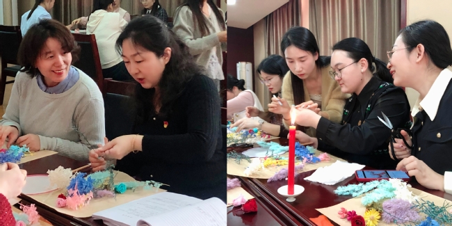 通过永生花纨扇沙龙活动,党员干部教师缓解工作压力的同时也提升了个人艺术素养,增进了团队凝聚力和幸福感。大家表示,希望能够在工作之余进一步丰富支部文化生活,强化优秀传统文化传承创新的生动实践,激励干部教师更加坚定对真善美生活的坚守和追求。在新的学期,支部全体党员干部也将以更饱满的精神和更充沛的精力立足本职做好工作,充分发挥先锋示范作用,在拼搏中实现自我价值,为学校发展作出更大贡献。活动结束后所有同志携花艺纨扇作品合影留念。