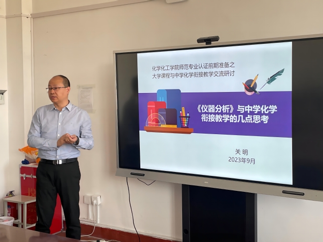 随后,关明以“《仪器分析》与中学化学衔接的几点思考”为题,从师范专业认证的背景需求、课程标准涉及的相关内容以及衔接教学的几点思考建议切入,详细阐释了师范专业认证的目的、本科师范专业学生的培养质量、标准和要求,解析了师范类专业认证的理念。讲座中,关明还结合普通高中化学课程标准,以《仪器分析》课程为例,向老师们展示了本科课程与高中化学的知识点衔接,并针对此类衔接课程可以使用的教学方式和教学思路,带领老师开展深入思考和互动交流。