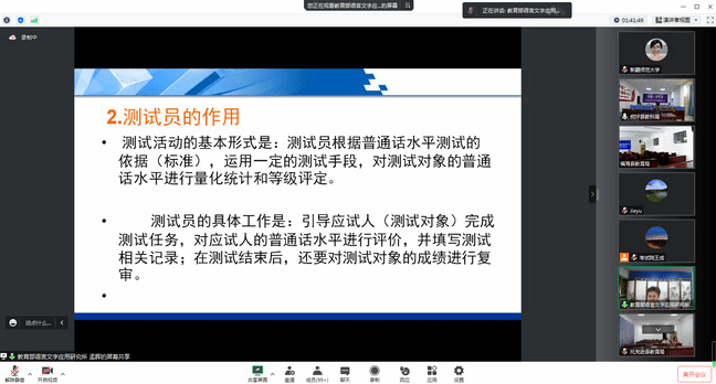 自4月1日起,国家普通话水平测试全面启用新系统、实施新规程,在考试方式、操作技术、考务组织等方面都有了新变化。本次测试员培训视频会由自治区教育考试院组织开展,旨在进一步做好新规程下全区普通话水平测试工作,加强测试员队伍建设。培训会上,自治区教育考试院领导及专家按照国家语委修订印发的《普通话水平测试规程》(国语函〔2023〕1号)相关要求,重点说明国家测试新规实施后测试员应知应会的新变化,按步骤演示了新系统的评分流程。全体测试员纷纷表示,这次培训举办及时、指导性强,通过培训,对新系统的评分规则和实操以及普测工作的重要性有了更加深刻的认识,加深了对业务知识的理解,明确了新时代普测事业的发展方向和工作重点。