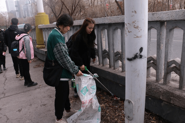“胡杨先锋班”成员与各支部党员清扫路面垃圾与杂物