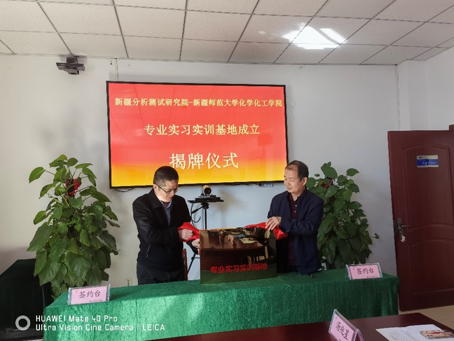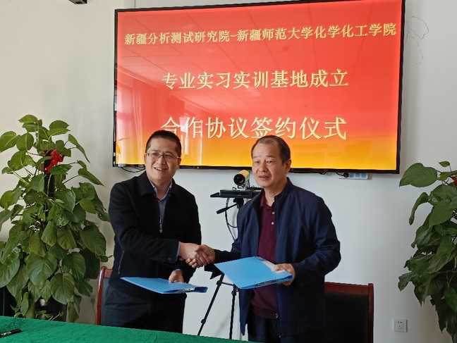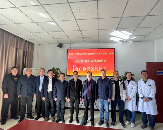 为加强化学化工学院专业实习实训基地建设,进一步扩宽学院科学研究、对外合作发展路径,4月13日上午,化学化工学院党委书记张鑫,副院长罗时玮、崔现宝,环境科学与工程系主任王庆赴新疆分析测试研究院举行专业实习实训基地合作签约挂牌仪式。新疆分析测试研究院党委书记宋良辉、副院长杨中、光谱所所长赵林同、研究所所长李慕春、色谱所所长曹雪琴、业务质管部部长杨伟翔、副研究员陈国通、研究院办公室主任汤兆星参加签约揭牌仪式。
