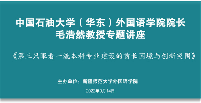 活动伊始,刘蓉就本次活动的开展目的进行了介绍与说明。随后,中国石油大学(华东)外国语学院院长毛浩然教授以《第三只眼看一流本科专业建设的困境与创新突围》为题做精彩讲座。毛浩然教授结合中国石油大学(华东)外国语学院一流本科专业建设实践,从困境和创新突围两个方面,介绍通过凝练学科优势、激励教师成长、加强课程团队建设、创新产学研协同育人,促进国家级一流专业和一流课程申报立项与建设的经验和思考;强调一流本科专业建设首先要打破教师和团队的自我认知局限,以大格局、大视野统筹大战略。
