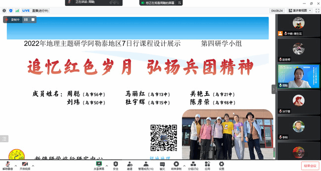 会议主要内容为7月19日至25日新疆地理学会组织全疆中学教学名师赴阿勒泰开展“研学野外实践及研学课程开发”活动成果展示会,由特邀讲座和阿勒泰地理学课程设计展示两部分组成。特邀讲座由赵桂庆主持,焦黎致辞,艾孜买提江带来题为“地理野外考察方法在研学实践中的应用”的讲座;王喜峰结合自己研学旅行的理解和感悟,带来“教师研学,寻找最好的自己”的讲座;最后由365英国地理科学与旅游学院20级地理科学专业学生胥芹梅展示获国家一等奖的研学课程设计——“寻‘月光’之景,扬文化之道——独克宗古城研学课程设计”。