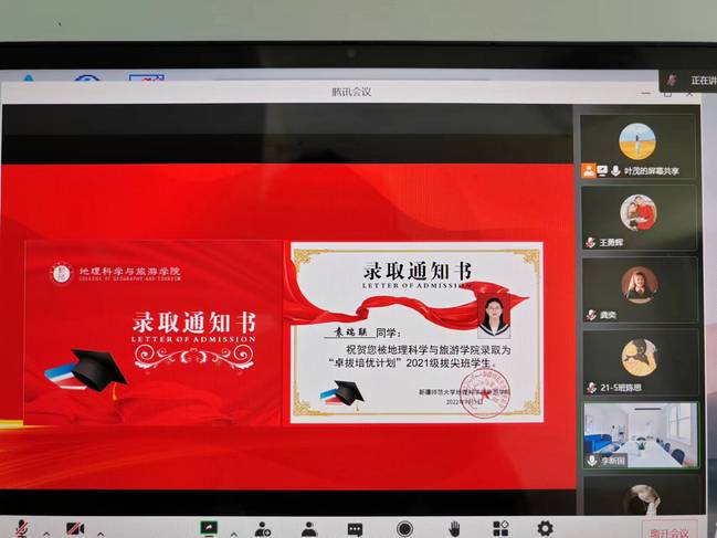 地理科学与旅游学院党委副书记、纪检委书记赵直宣布本届“卓拔班”入选学生和导师名单,“拔尖班”班主任李新国在线颁发电子录取通知书。“卓拔班”学生代表于舒杰、刘佳琳在发言中表示,感谢学校和学院提供好的平台,同学们将充分激发潜能,坚定努力学习的决心,尽早进入科研型人才培养计划。导师代表杨涵围绕“如何培养科研兴趣”“如何更好地与导师交流”“社会对高校毕业生的要求”等三个问题与大家详细交流,表示导师们会全力以赴,助力卓拔人才培养。