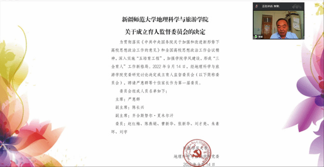 为进一步贯彻落实《中共中央国务院关于加强和改进新形势下高校思想政治工作的意见》和全国高校思想政治工作会议精神,形成“三全育人”工作新格局,不断加强育人过程中学校与学生和家长之间的沟通和联系,让大学教育主动接受社会监督,地理科学与旅游学院于9月28日下午在线上举行了首届育人监督委员会启动仪式暨聘任大会。校党委宣传部副部长阿布都米吉提·吾买尔、地理科学与旅游学院领导班子、全体教师及家长和学生代表共300余人参加。