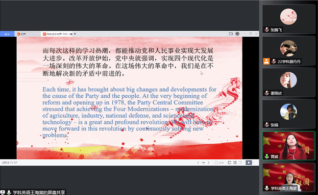 10月5日下午,教师第二党支部联合研究生党支部开展“学思践悟迎国庆,砥砺奋进二十大”——《习近平谈治国理政》双语小课堂活动。教师党员索菲娅与研究生党员韩霜以中日双语领学《习近平谈治国理政》第一卷第六章第四篇“培育和践行社会主义核心价值观”;教师党员张娟与研究生党员谢雨欣以中英双语解读《习近平谈治国理政》第一卷第二章第三篇“实干才能梦想成真”;教师党员黄威和研究生党员王海棠用中英双语分享诵读《习近平谈治国理政》(第一卷)第十八章的第二篇“依靠学习走向未来”。通过此次《习近平谈治国理政》双语小课堂活动,党员师生从经典阅读中汲取了营养,开阔了视野,增强了党性修养,提升了用外语讲好中国故事的能力。
