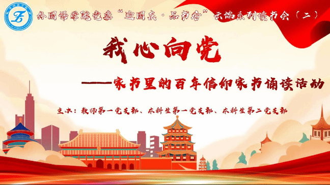 为庆祝祖国73岁华诞,进一步引导全院师生养成读书的良好习惯,营造“爱读书、善读书、读好书”的阅读氛围,10月1日至10月5日,外国语学院党委开展了“迎国庆·品书香”云端系列读书会。本次读书会共分为“书香致远 · 悦读阅美—党员读书分享”、“家书里的百年信仰家书诵读”、“《习近平谈治国理政》双语小课堂”三期举行,外国语学院全体党员师生参加。