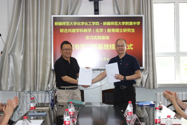 乌鲁木齐市第一中学校长罗群雁、师大附属中学党委书记吕志新在致辞中表示教育硕士研究生实习实践基地的签约是对两校教育质量的高度肯定和信任,将对学校与实习研究生的双向选择带来积极影响,真正让实习研究生把学到的理论知识转化为教学实践能力,两校将努力提升实习研究生的师德、师风、师能,与化学化工学院共同努力,培养优秀的化学学科教育硕士英才。