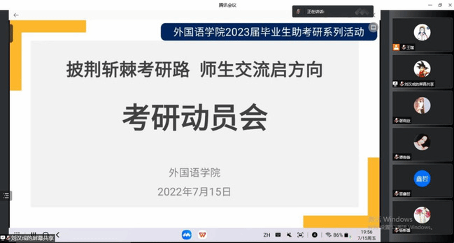 7月15日,外国语学院召开2023届毕业生考研线上动员会。本次会议特邀校研究生处综合科科长谭俊蕾、学院副院长杨新璐、辅导员王瑾及5名已考取研究生的优秀毕业学子分享交流考研政策形势与备考经验。全体院领导、专业系部负责人、毕业班学业班主任、全体辅导员及毕业生参会,学院党委副书记刘汉成主持会议。