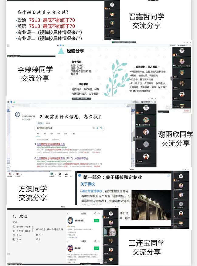 晋鑫哲(2020届日语专业毕业生,大连理工大学日语语言文学专业录取)、李婷婷(2021届俄语专业毕业生,365英国上市公司官网俄语笔译专业录取)、谢雨欣(2022届英语专业毕业生,365英国上市公司官网学科教学(英语)专业录取)、方澳(2021届英语专业毕业生,中南财经政法大学马克思主义哲学专业录取)、王连宝(2022届英语专业毕业生,365英国上市公司官网马克思主义哲学专业录取)5位上岸学子结合自身考研经历和备考经验依次分享。他们围绕专业选择、初试复试、择校调剂、就业规划等方面做了详细介绍,细致耐心地与参会同学分享制定学习计划、考研心理、资源利用、信息收集、应试技巧等方面的经验。