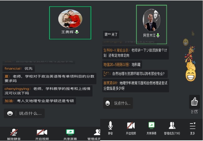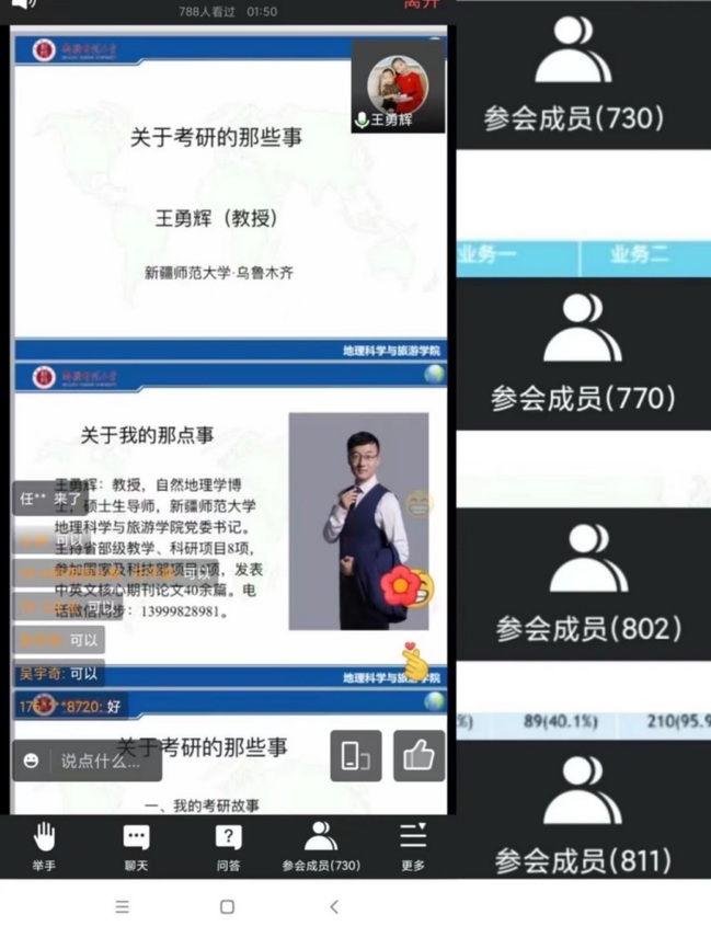 为大力加强学风建设、全面落实高层次人才培养计划,为考研学子提供一个交流、分享、咨询的平台,地理科学与旅游学院于8月31日通过腾讯会议为2023届毕业生举办了考研经验交流会。地理科学与旅游学院党委书记王勇辉教授、副院长阿里木江•卡斯木教授出席本次交流会并做汇报。来自365英国上市公司官网、石河子大学、喀什大学、伊犁师范大学、塔里木大学的800余名学生参会,会议点赞数达到3.38万。