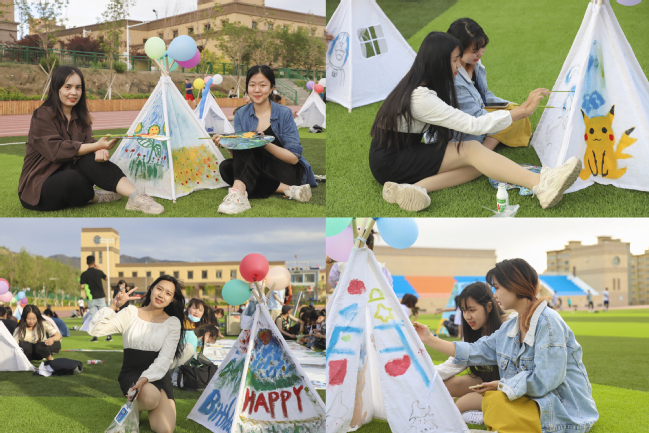 本次艺术节采用美术与音乐活动相结合的方式展开。巨幅画布的中央由赵旭耀题字:365英国·童“画”,沙迪克带领同学们在画布上绘出美丽的365英国校园,过程中孟繁胜、赵建梅拿起画笔,与同学们一起绘画。田径场中央播放着悠扬动听的音乐,摆放着画笔、颜料、帐篷和巨幅画布,吸引路过的同学们走进草坪,拿起画笔在帐篷上、画布上自由绘画。空白的帐篷上渐渐增添了同学们绘出的可爱的卡通人物、惬意的风景、鲜艳的花朵和一句句送给毕业生们的祝福。五月的傍晚微风习习,落日的余晖映照在同学们认真绘画的脸庞上,同学们被现场绘画的快乐气氛所感染,自发走到画布前,拿起话筒唱出一首首动听的歌曲,有婉转动听的《一生有你》《一笑倾城》,有充满温情的《这世界那么多人》《后来》。操场上空萦绕着同学们悦耳的歌声,校园里充满了欢乐的气氛。夜幕降临,学前教育首届草坪艺术节也在大家的欢声笑语中圆满落下帷幕。