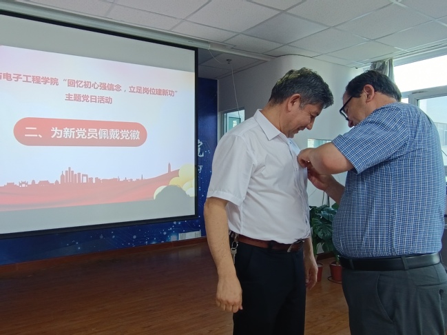 在学院党委组织员赵海琴的主持下,教工第一、第二党支部与研究生支部党员共同参加了“回忆初心强信念,立足岗位建新功”主题党日活动。大家首先观看了《你,为什么入党?》视频,在振聋发聩的提问与坚定的回答中再次体味和升华自己的入党初心。老党员巴哈德尔为今年新入党的教师党员代表杜力坤亲手佩戴了党员徽章,既是嘱托也是传承,现场气氛无比温馨。新党员杜力坤异常激动,感慨万千。