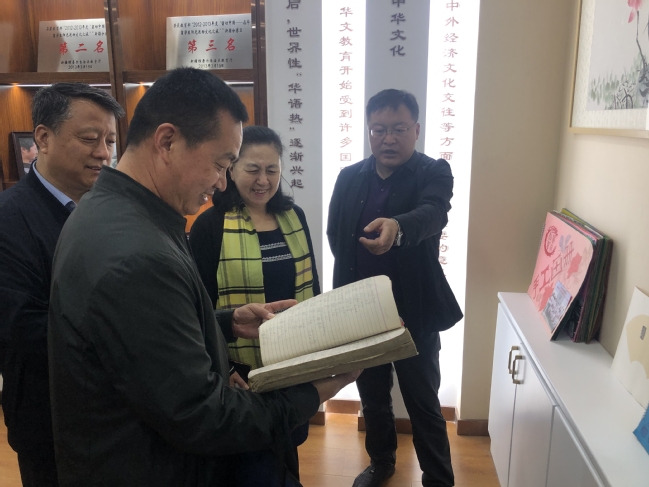 国际文化交流学院领导班子陪同侨联一行人参观了华文教育陈列室,国际文化交流学院院长伊莉曼·艾孜买提介绍了学院从2011年华文教育基地揭牌以来,华文教育的发展历程和所取得的成就。