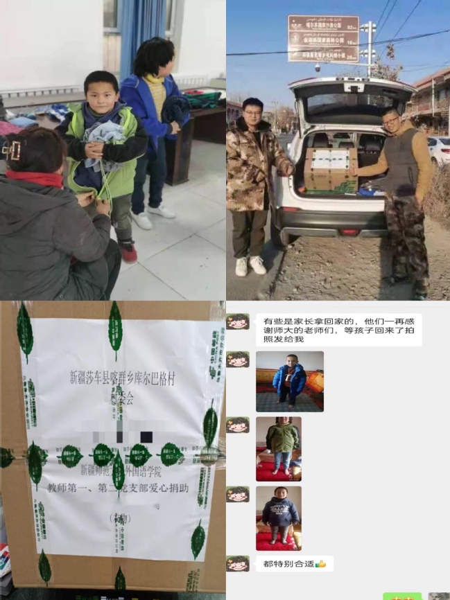 此外,教师第一党支部与第二党支部还联合开展了“爱心衣物捐赠活动”,党员教师积极捐献家中干净的闲置御寒衣物,在寒冷的冬日为莎车县喀群乡库尔巴格村的孩子们送去一份温暖。