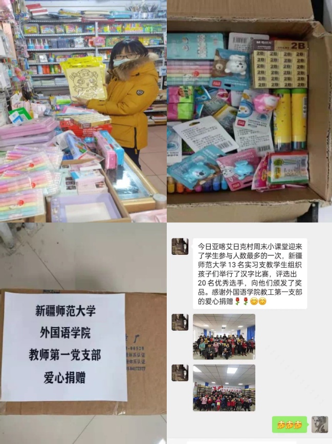在学院党委的倡议下,外国语学院党委教师第一支部组织开展了“传递爱心·点亮智慧”捐赠活动。第一支部党员教师通过捐款、捐赠等形式为当地的孩子们置备学习用品。收到由教师第一党支部募集捐款购买的文具后,亚喀艾日克乡中心小学的老师发来领取捐赠物品的现场照片,并与孩子们一起对外国语学院党员教师的爱心善举表达由衷的感谢。