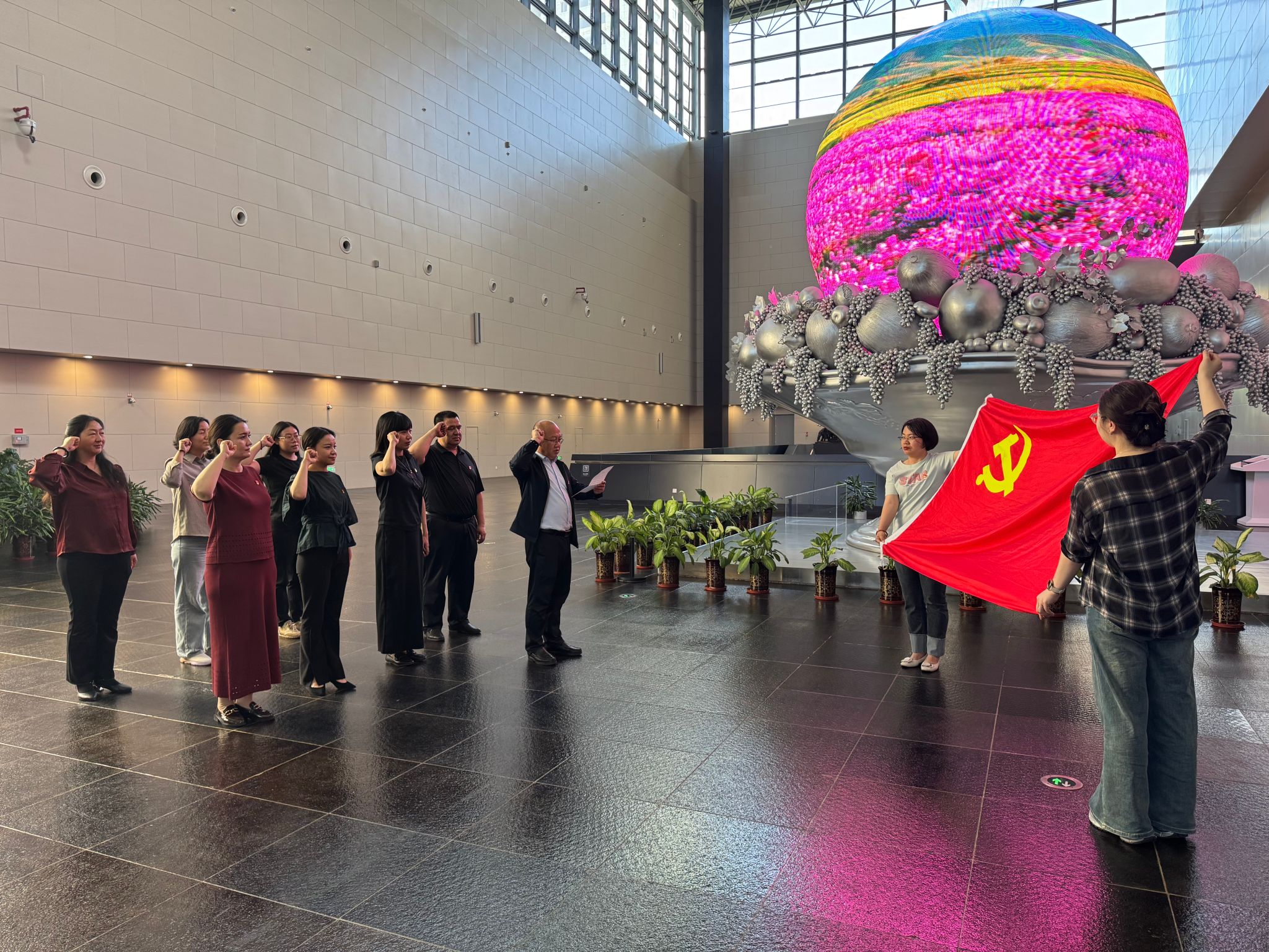参观结束后,在支部书记带领下,全体党员重温入党誓词。面对鲜红的党旗,支部党员整齐列队,右拳紧握、神情庄重,铮铮誓言让大家在精神上再次接受洗礼,激励大家以更饱满的热情、昂扬的斗志投身工作。