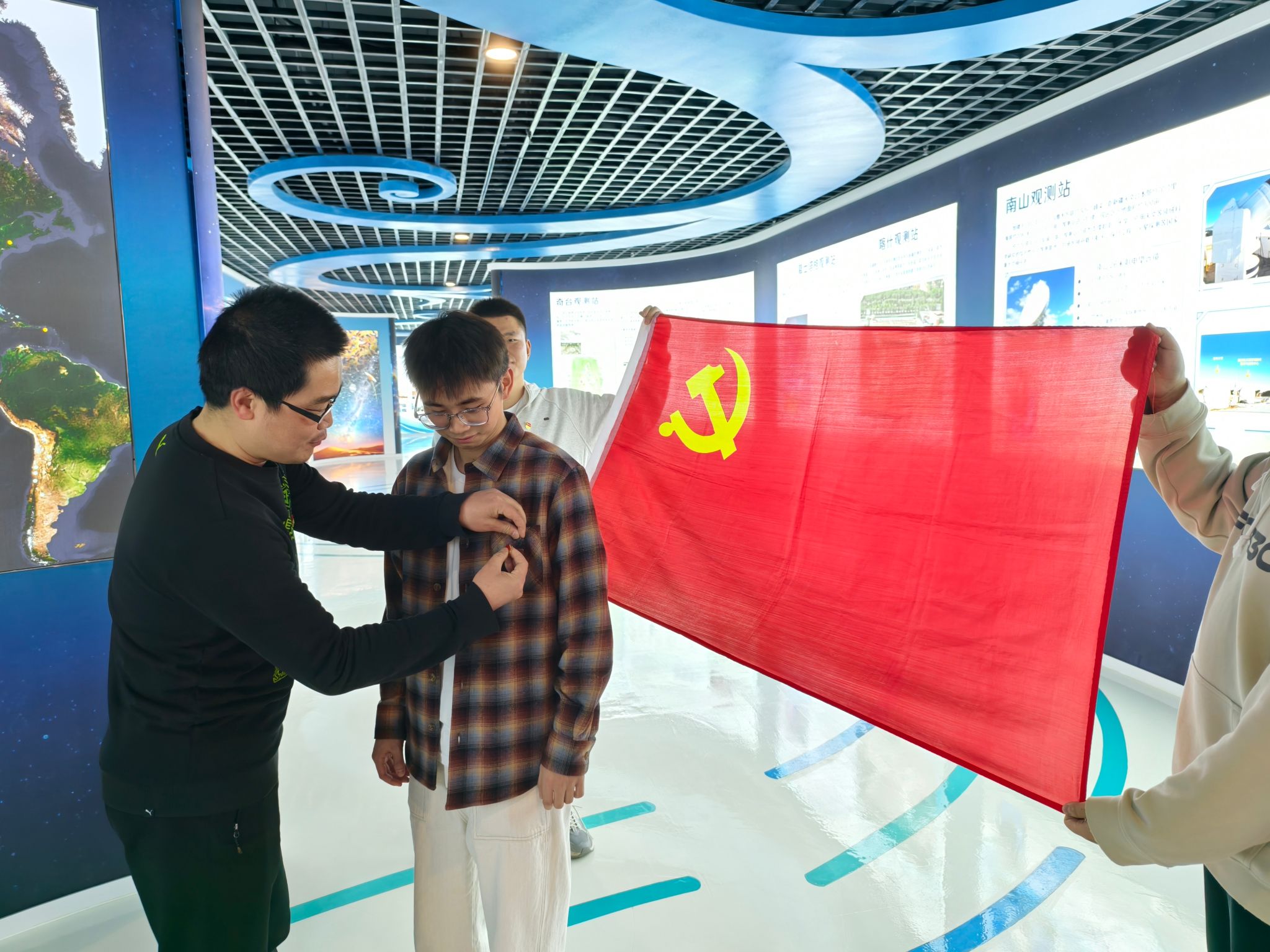 活动伊始,学院师生联合党支部和射电天文党支部全体党员在王凯同志的带领下面向党旗,高举右拳,用铿锵有力的声音重温了入党誓词。老党员代表为新党员王本贤佩戴了党员徽章。