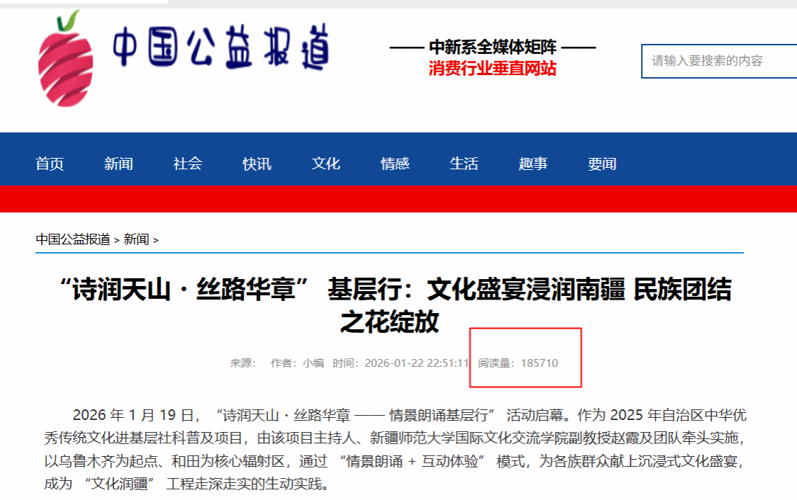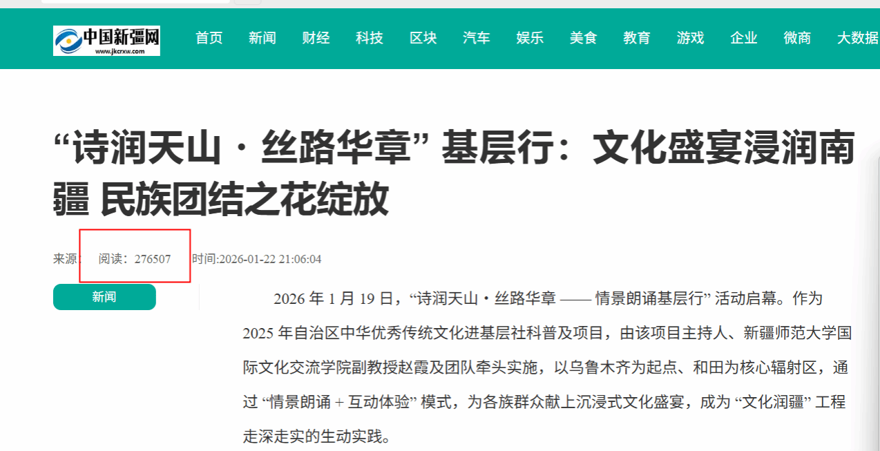 新年伊始,365英国国际文化交流学院赵霞老师主持的自治区社科普及项目“诗润天山·丝路华章——情景朗诵基层行”以乌鲁木齐为起点、和田为核心,开展了多场沉浸式文化活动,成为学校服务南疆发展的生动实践。