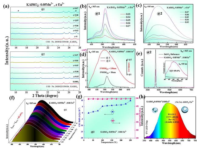 在白光LED中广泛应用的绿青色荧光粉中,半高宽、热稳定性、量子效率等是荧光粉性能的关键指标。这种荧光粉在不同温度下工作时要具有稳定的峰形和峰值位置的同时,要具有超宽带发射,利于实现二色发白光,并简化制备白光LED器件工艺。本文采用高温复烧策略合成了一系列KAlSiO4: Eu2+,Mn2+ 发光材料。物相分析和精修结果表明样品均有效合成。通过首次煅烧,得出明亮的绿粉,发射主峰在514nm处,半高宽30nm。通过复烧策略发现代表样品在近紫外光照射下的体色从绿色变为非常接近白光的绿青光发射,发射范围较宽,可以包含蓝光和绿光,半高宽可高达150nm。复烧后代表样品的发射强度提高3.4倍,在近紫外波长激发下量子效率均高达90%,150℃时的发射强度是室温的82%。拉曼光谱测试结果表明复烧对样品的晶格对称性带来了好的影响,促进了样品的发光强度。基质光学带隙实验值为5.6 eV,通过DFT计算发现带隙为4.8 eV,说明热稳定性良好,样品在高温下的色度位移很小,说明色度稳定性良好。365nm近紫外芯片与商业宽带红粉和复烧后的代表样品相结合,形成的白光LED器件在不同电流驱动下的显色指数均高达90以上,说明复烧策略成功提高了代表样品的各项发光性能。验证了KAlSiO4: Eu2+,Mn2+ 荧光粉在白光LEDs照明领域中具有较好的应用前景,本工作为荧光粉发光材料在煅烧策略和颜色调控方面提供了新技术,在开发高色度稳定性和热稳定性的宽带荧光粉提供了设计思路和深入见解。