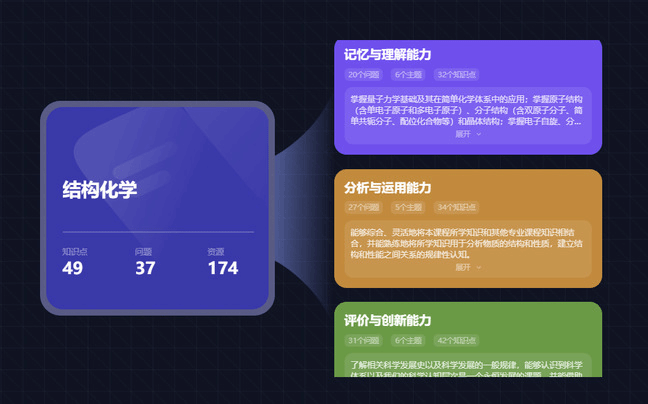 能力体系的构建则是课程的另一大亮点。课程通过问题导向的教学方法,学生在解决实际问题的过程中,能够逐步提升自己的分析和解决问题的能力。课程中设置的问题体系覆盖了从基础知识点到高阶思维的各个层面,鼓励学生主动探索、深入思考,力图通过知识图谱课程形式建立能力—问题—知识贯通的培养路径。