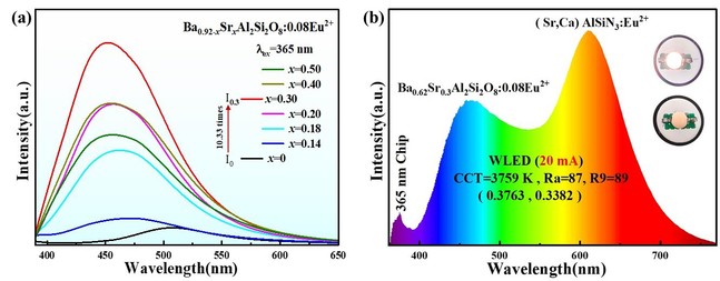 图片3 (a) Ba0.92xSrxAl2Si2O8:0.08Eu2+ (x=0~0.5) 荧光粉的发射光谱; (b)使用代表样品制备的WLED器件的EL光谱图