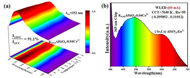 图片2 (a) K0.96AlSiO4:0.04Ce3+ 荧光粉的变温光谱; (b) WLED器件在60 mA电流驱动下的EL光谱图