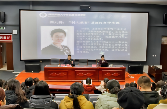 12月11日下午,研究生博约讲堂第九讲在温泉校区文科三号楼润疆厅顺利举行,全国优秀校长、乌鲁木齐市第四中学党总支书记、硕士生导师付传姝老师应邀作“‘树人教育’思想的办学实践”专题报告,近150名研究生到场聆听。