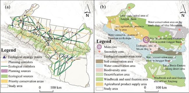 (a. 天山北坡城市群生态安全格局优化;b. 天山北坡城市群生态空间保护和恢复模式。)
